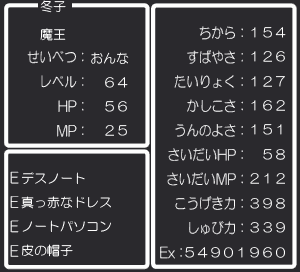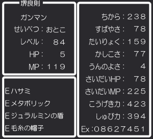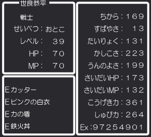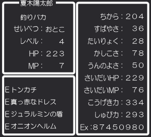 ちまたで噂…かどうかは知りませんが、見かけたからには食いついておきたい。こういうの大好きなんです!あっはー!ということで、ドラクエ風ステータス(←オンマウスでリンク)。